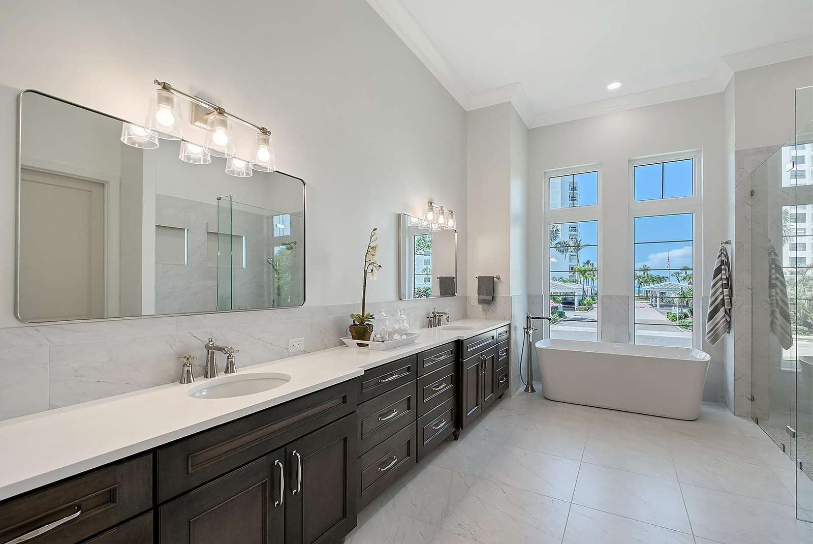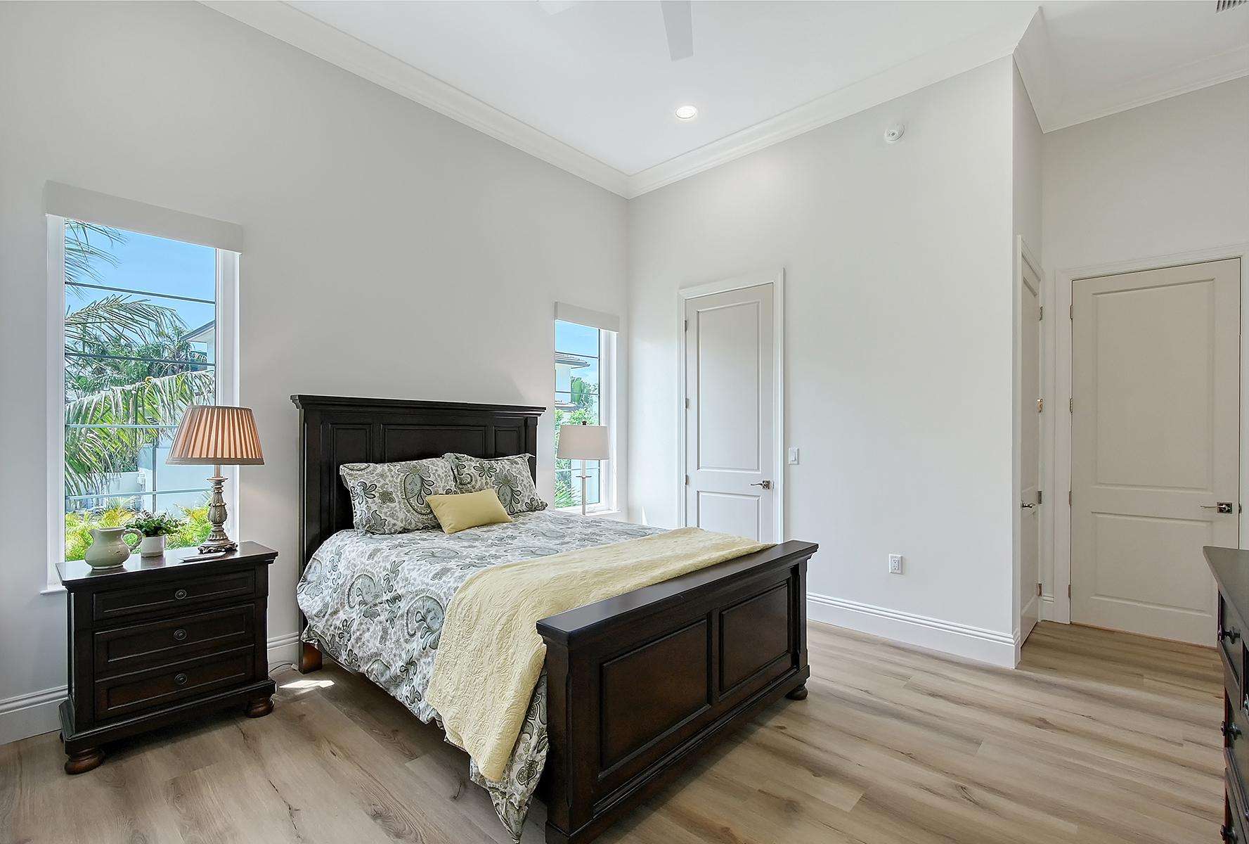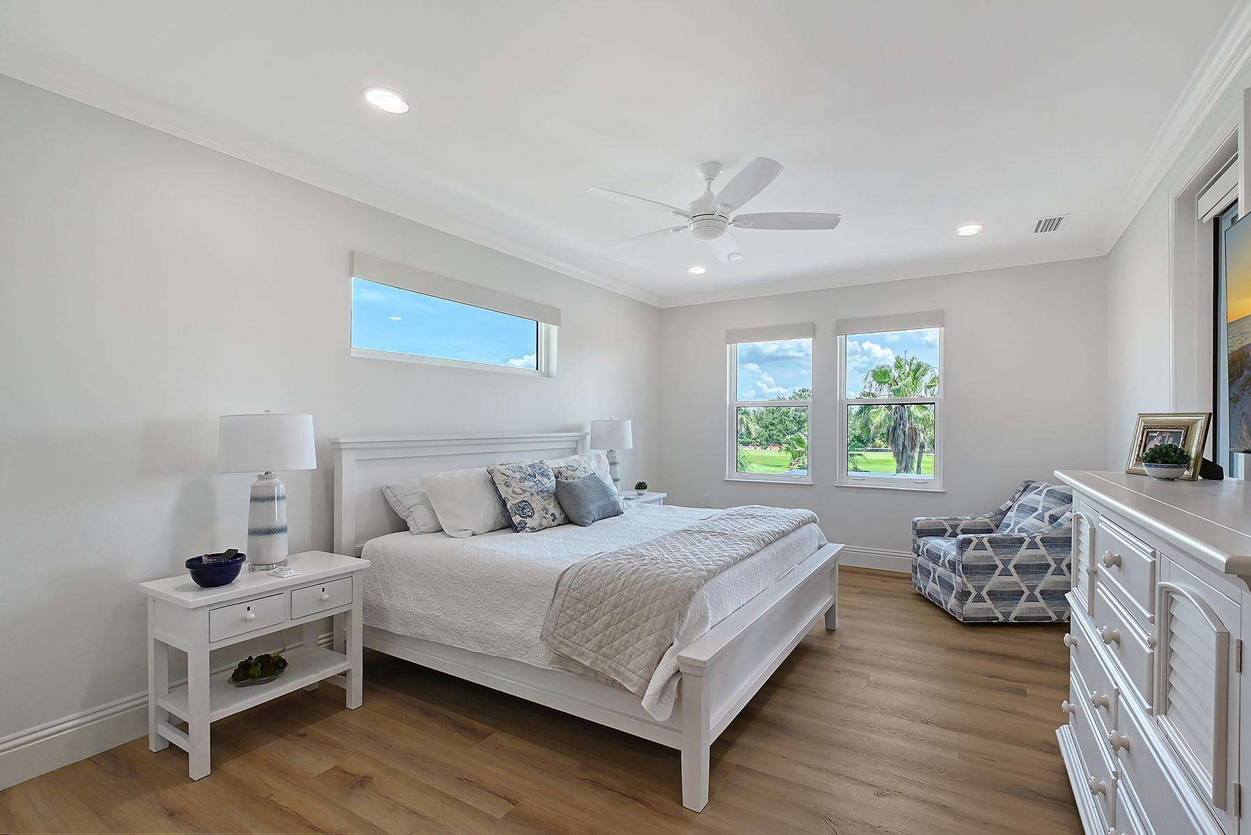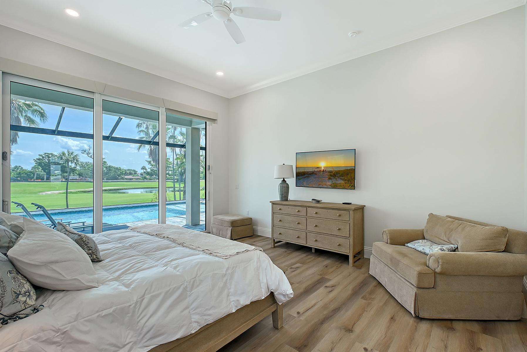 The kitchen opens up to the family room and the first-floor master suite opens to the pool deck and boasts his/hers walk-in closets, dual vanities, a Jacuzzi tub with separate glass-enclosed shower and water closet. The four guest bedrooms are all en-suite with lush tropical landscaped views.