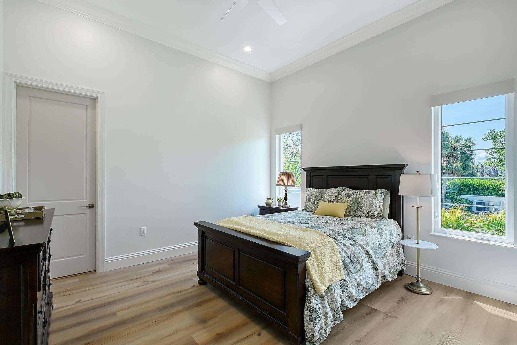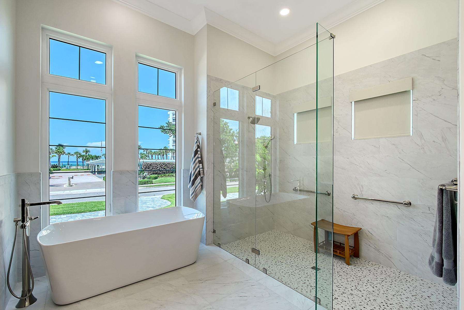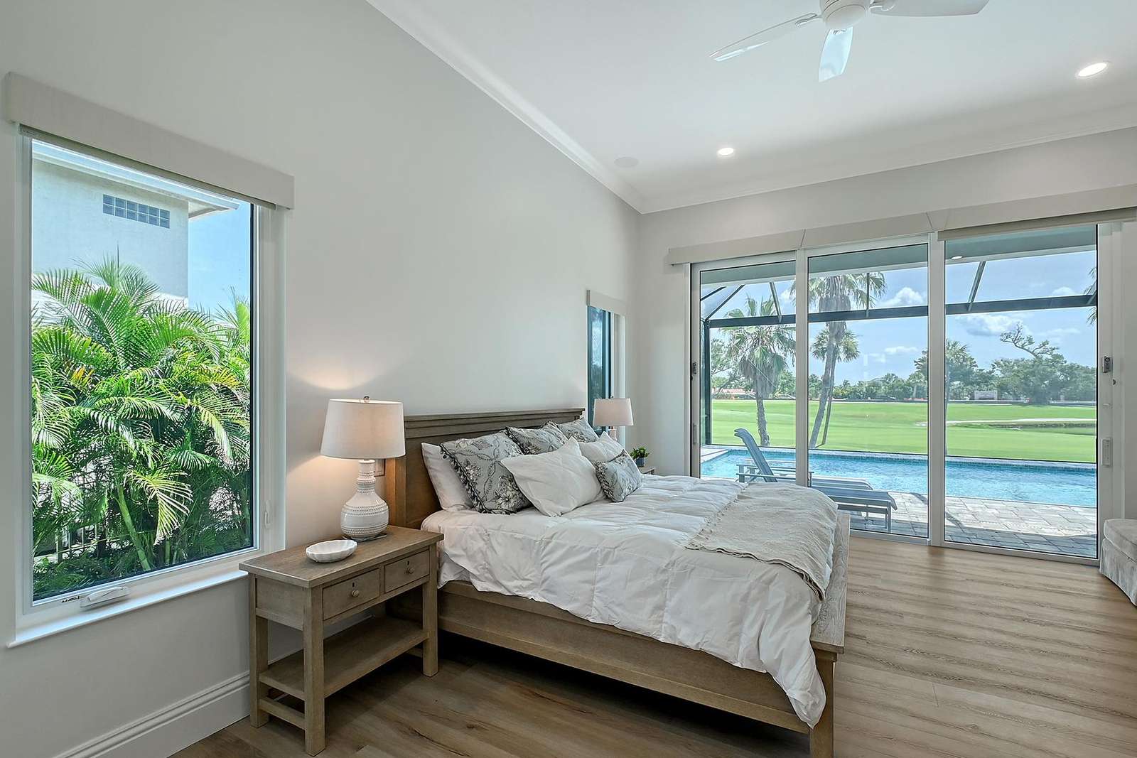 The kitchen opens up to the family room and the first-floor master suite opens to the pool deck and boasts his/hers walk-in closets, dual vanities, a Jacuzzi tub with separate glass-enclosed shower and water closet. The four guest bedrooms are all en-suite with lush tropical landscaped views.