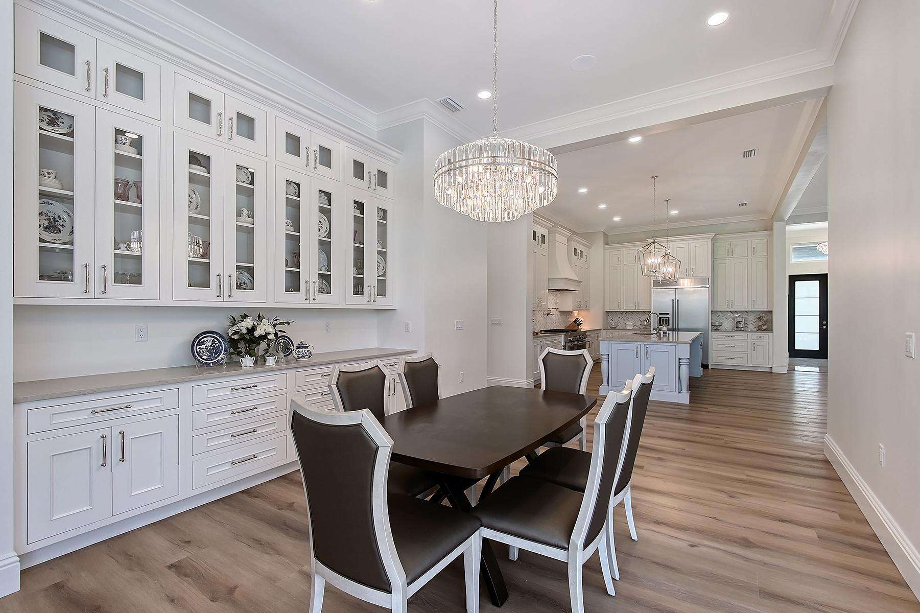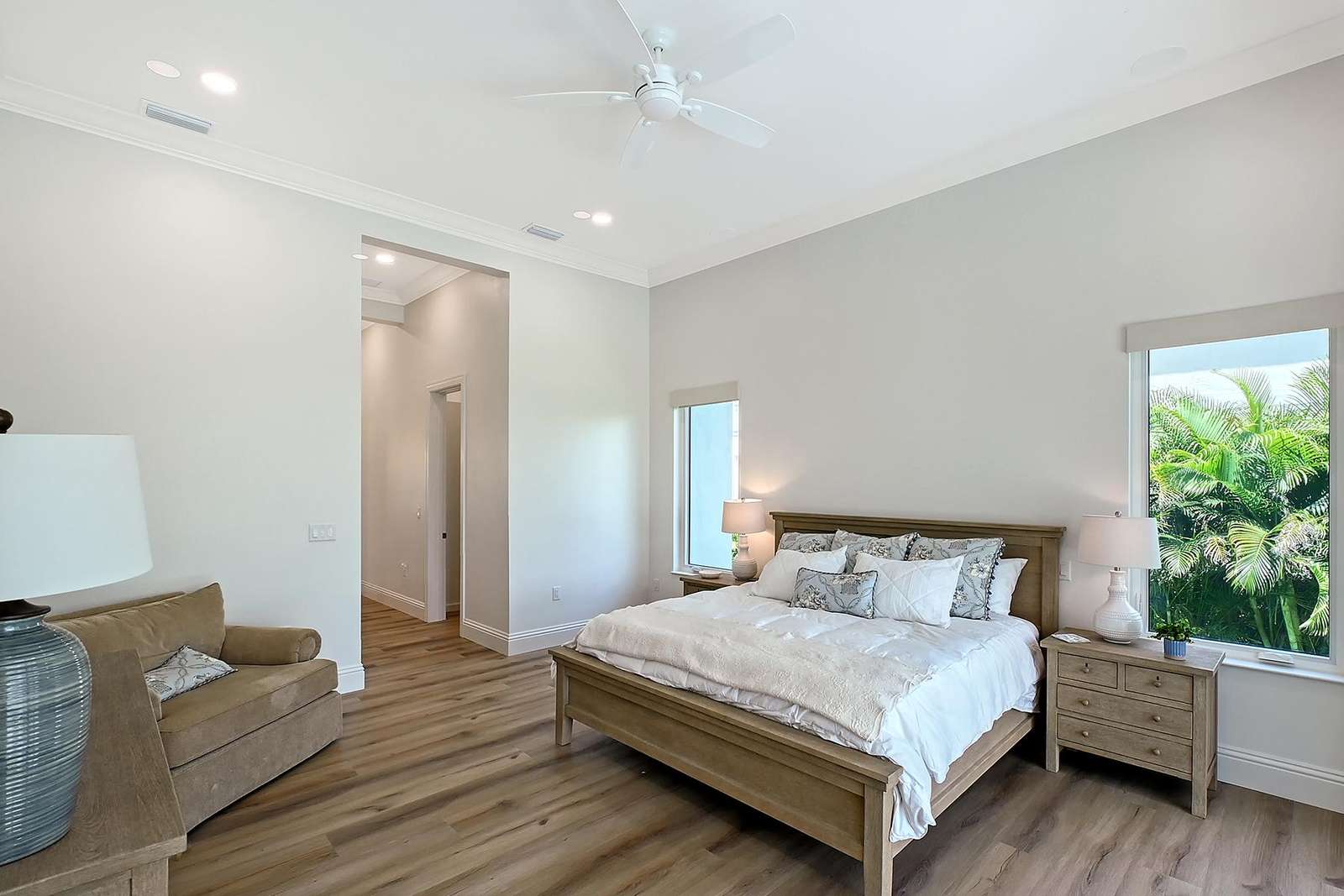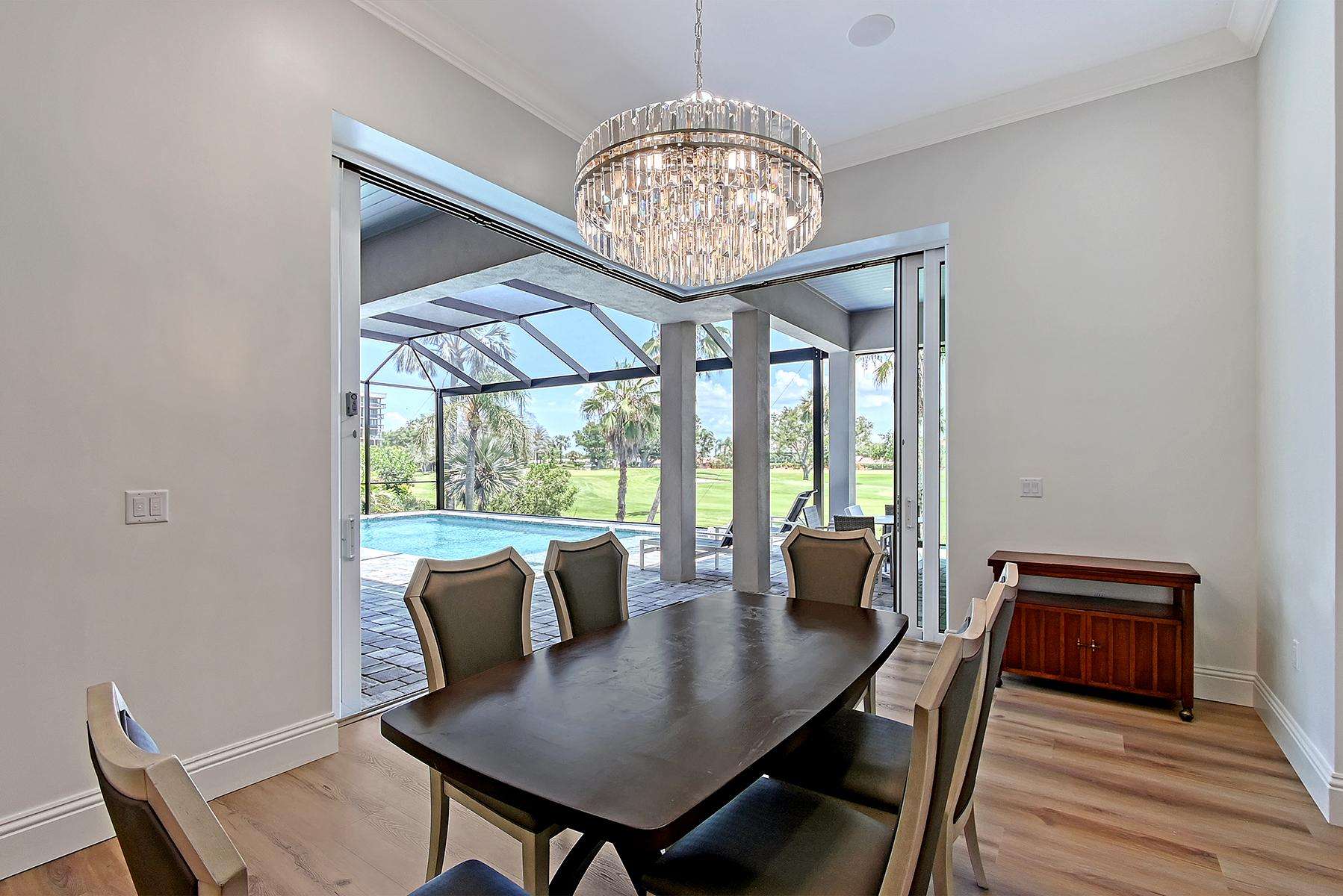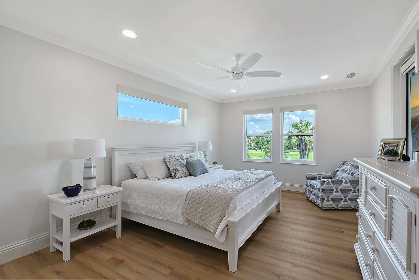 The kitchen opens up to the family room and the first-floor master suite opens to the pool deck and boasts his/hers walk-in closets, dual vanities, a Jacuzzi tub with separate glass-enclosed shower and water closet. The four guest bedrooms are all en-suite with lush tropical landscaped views.