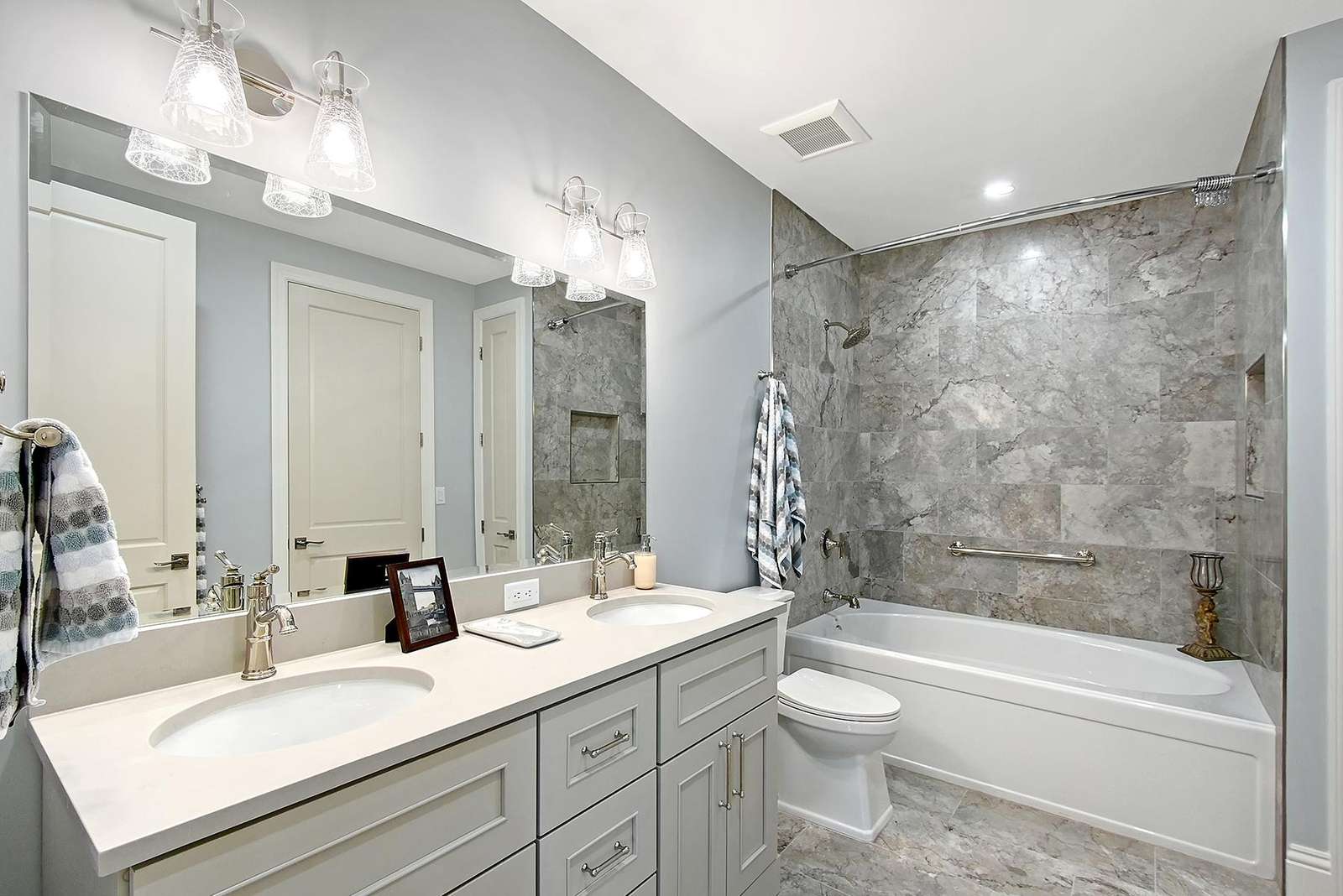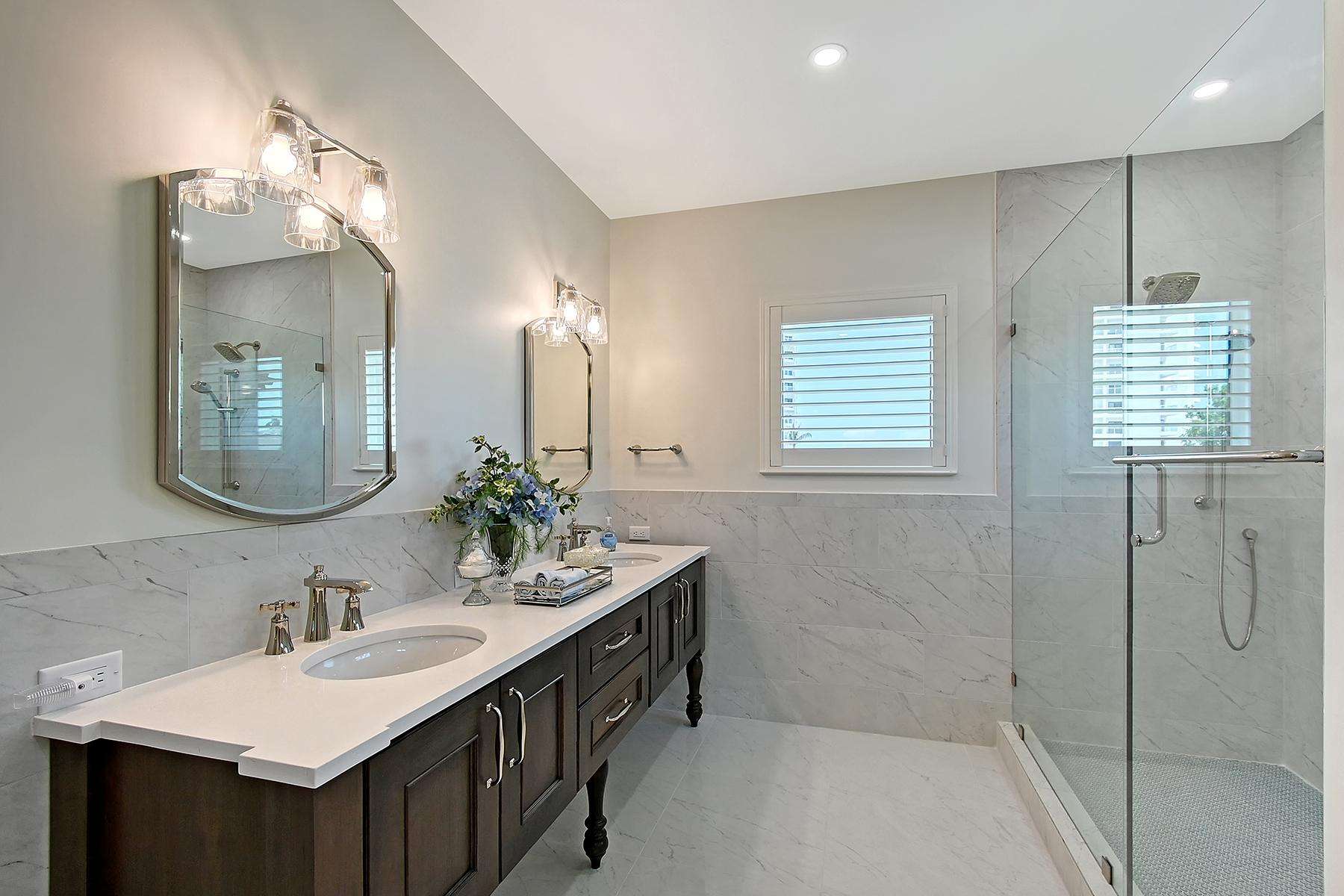 Lavish bath: double vanity, soaking tub, walk-in shower with grab bars