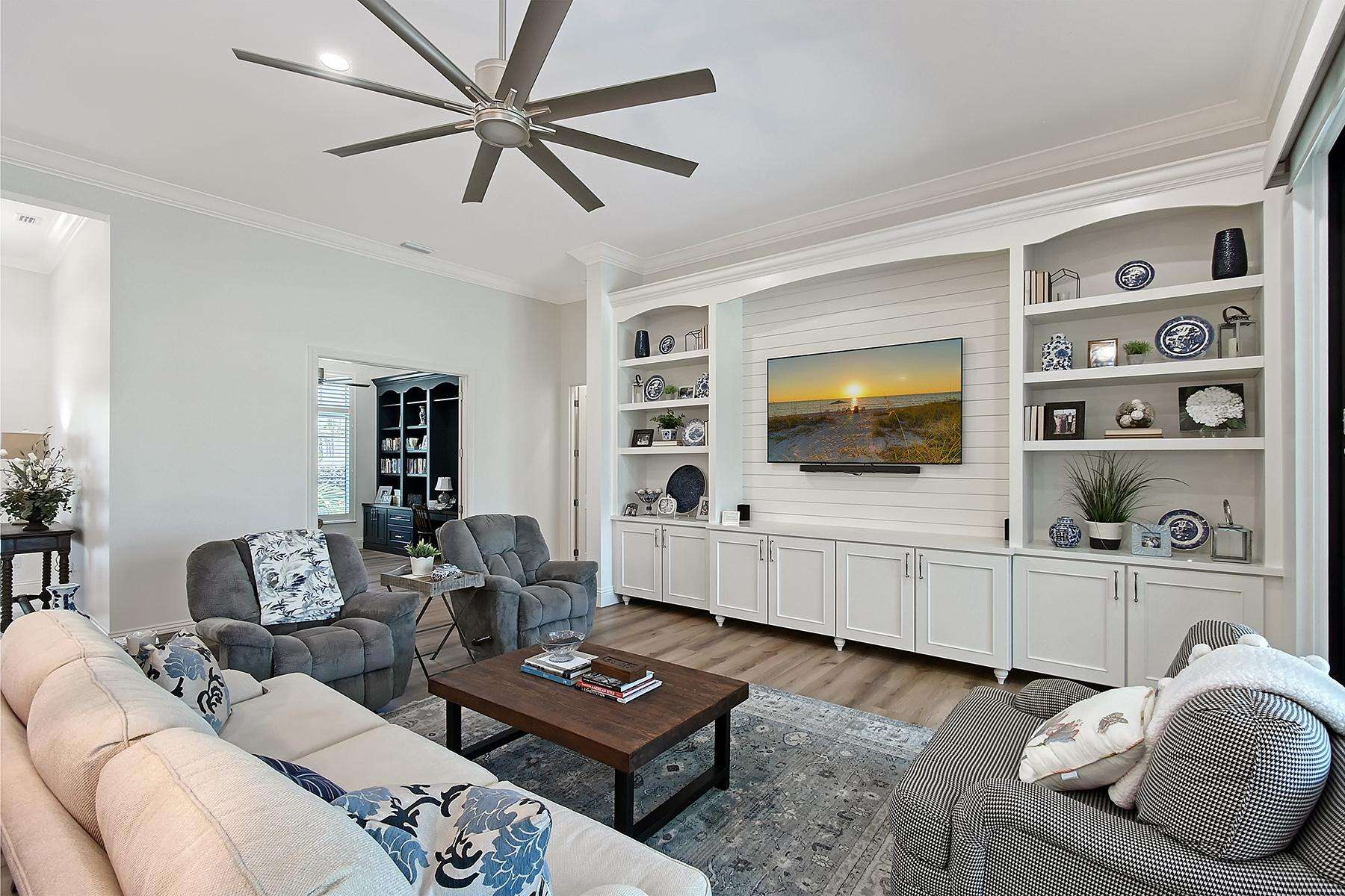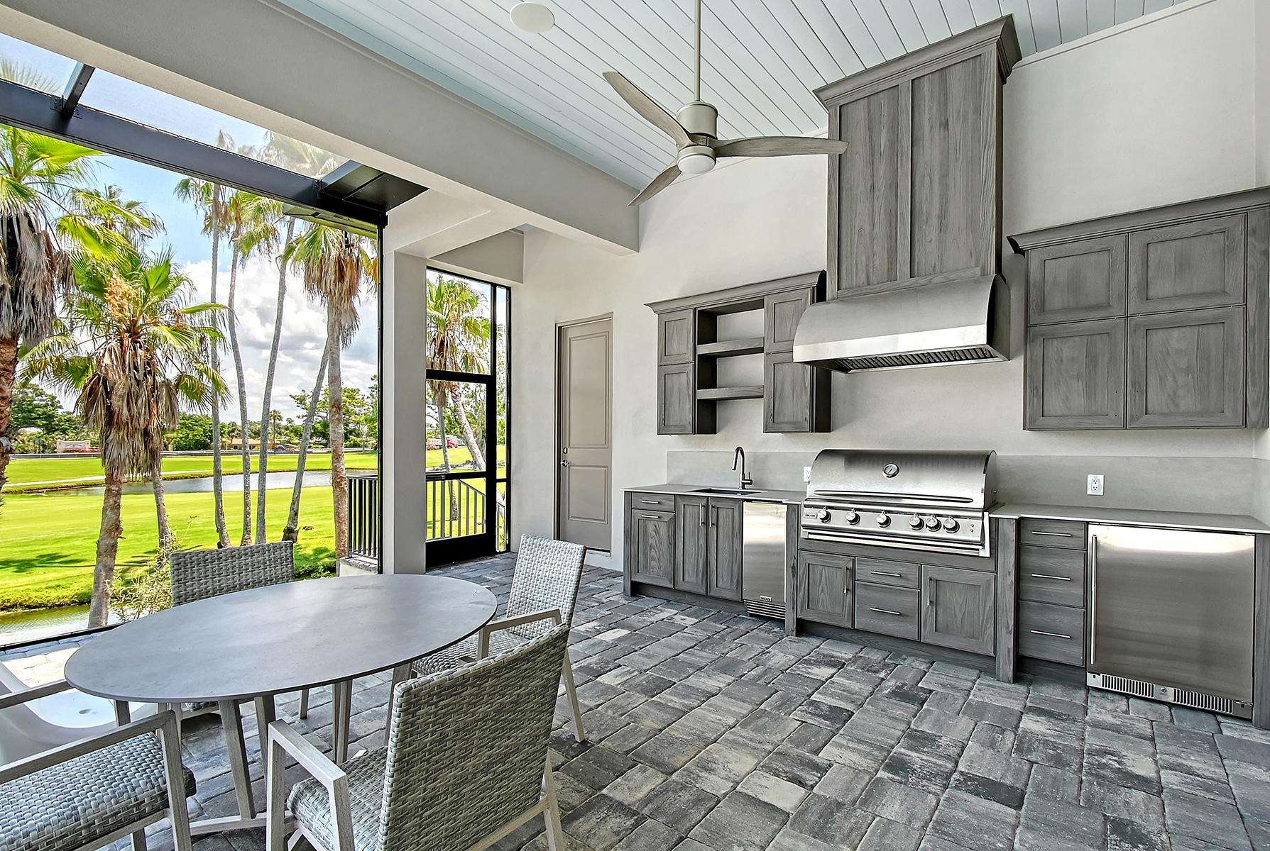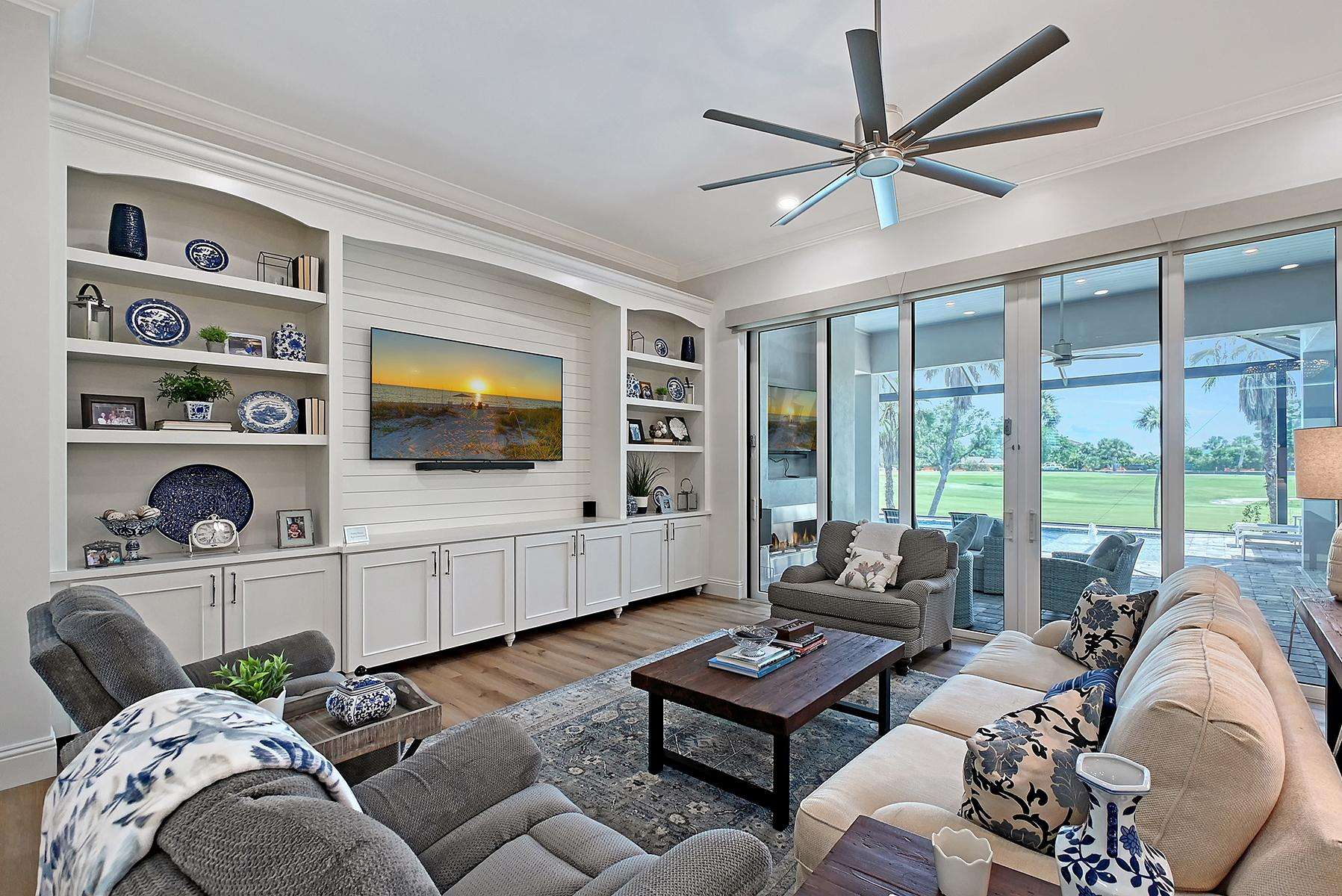 Outdoor family room with fireplace, large-screen TV, surround sound, and ceiling fans