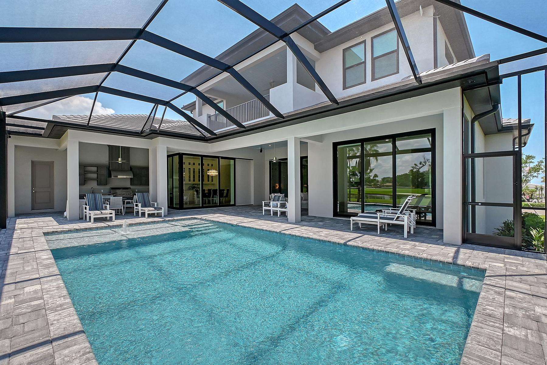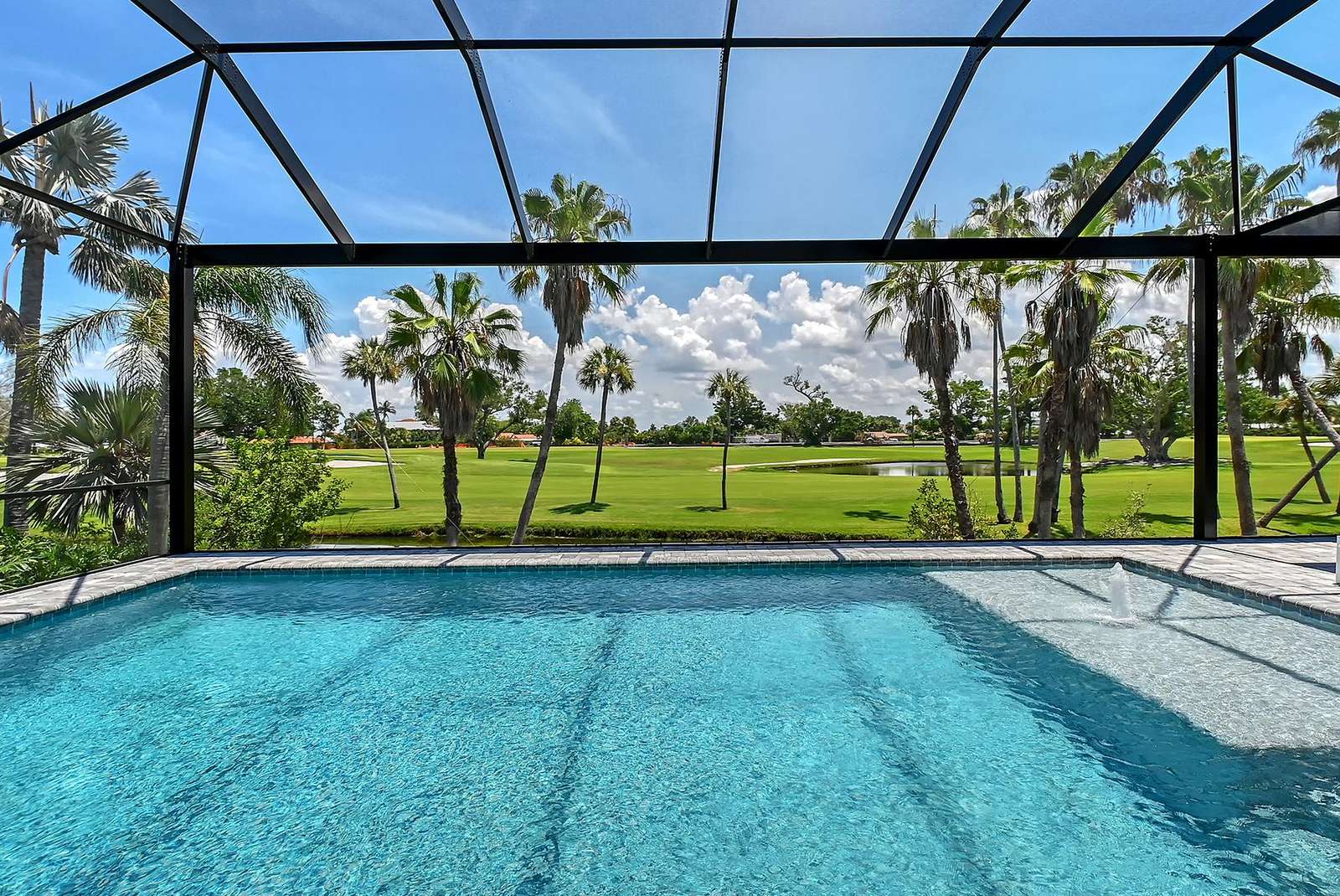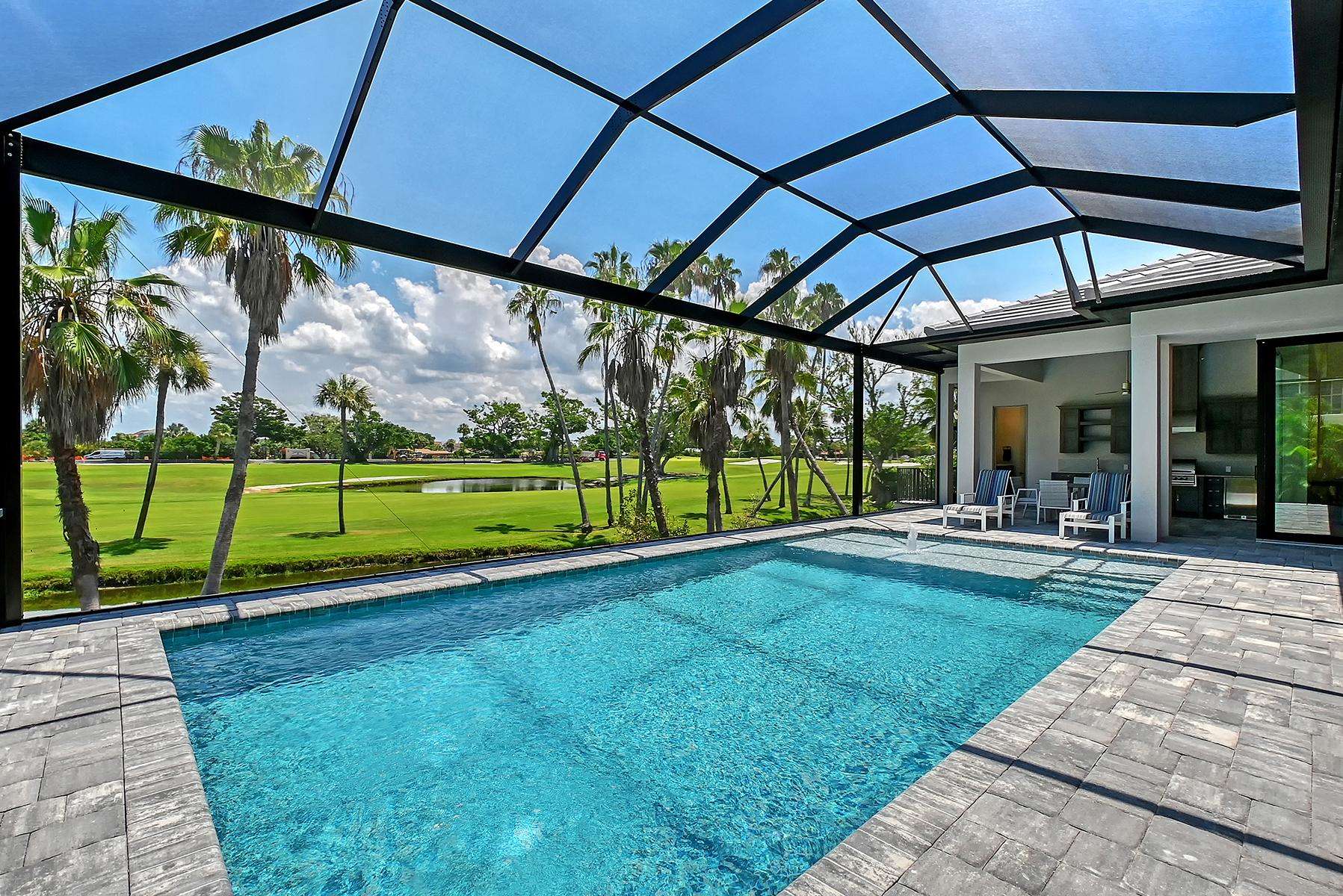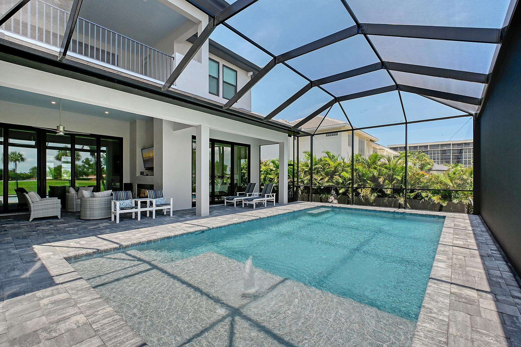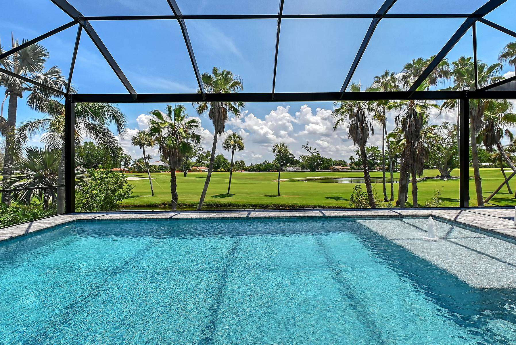 Screened-in pool with sunshelf, loungers, and multiple seating areas