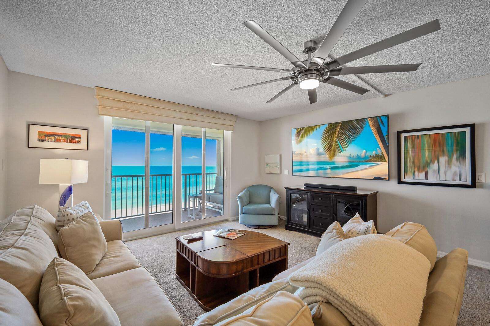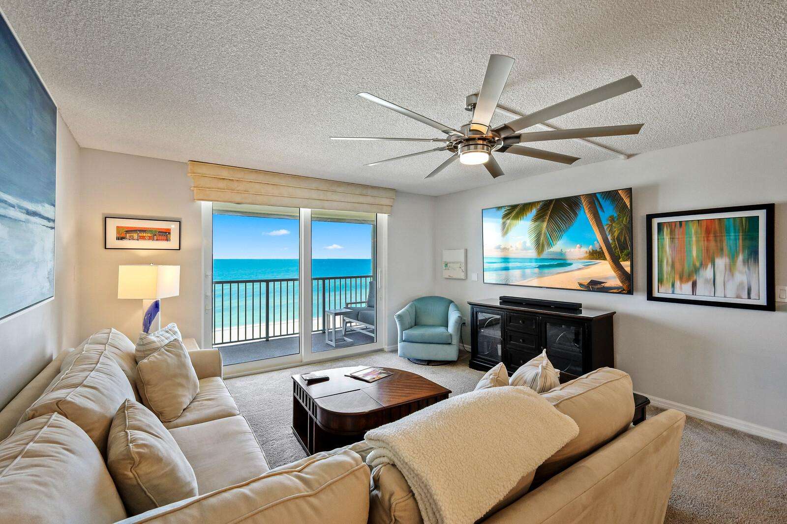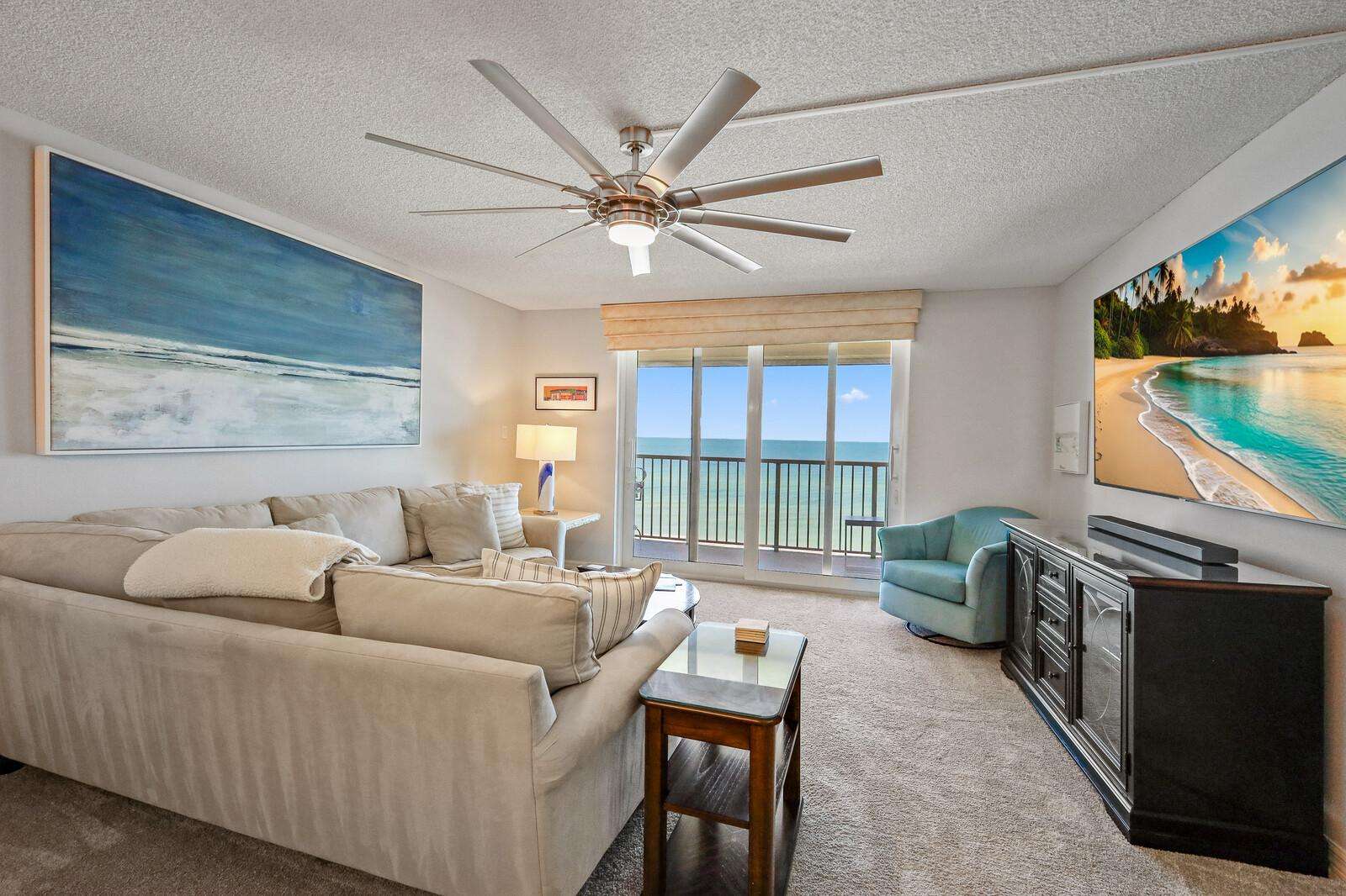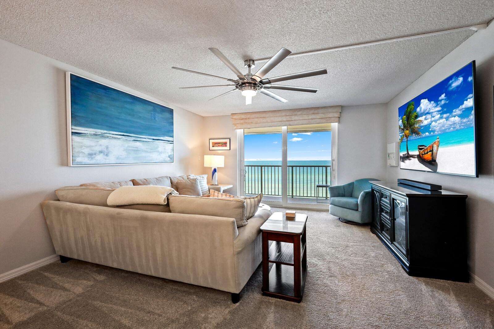 Spacious living room with gulf views and cozy seating