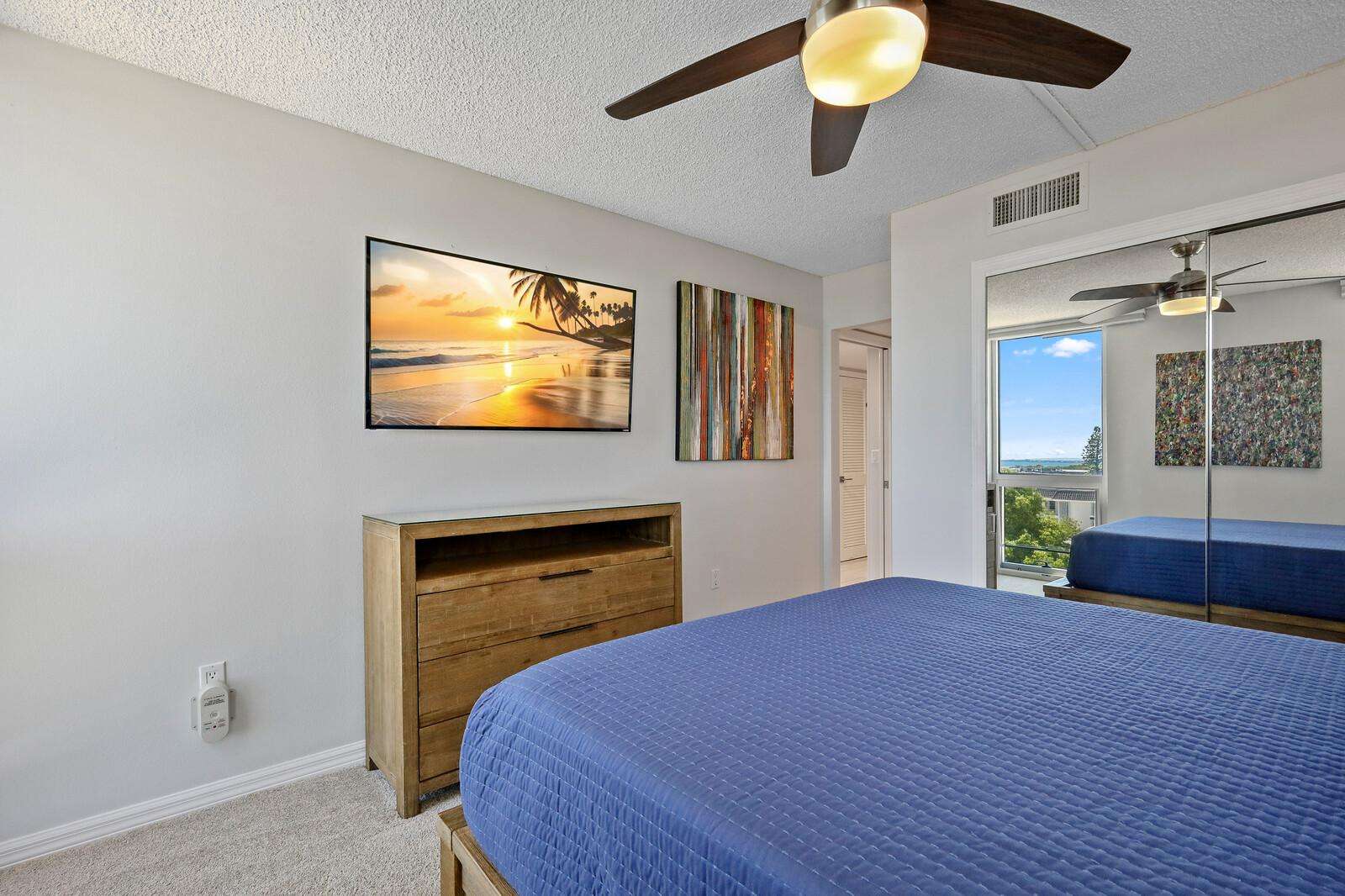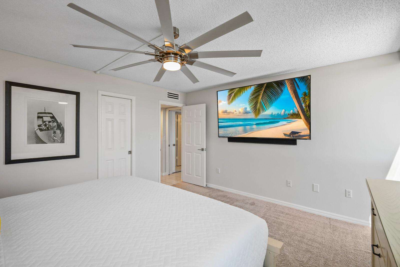 Bright, airy bedroom with ceiling fan and wall-mounted TV