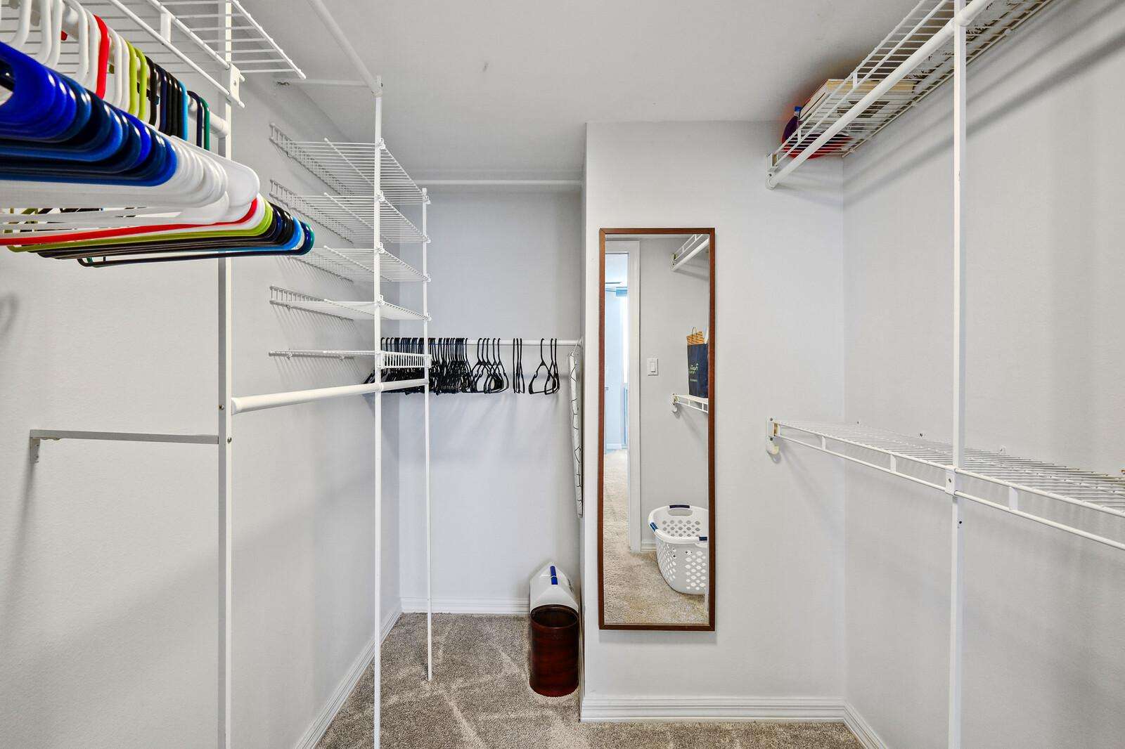 Spacious walk-in closet with organized shelving and full-length mirror