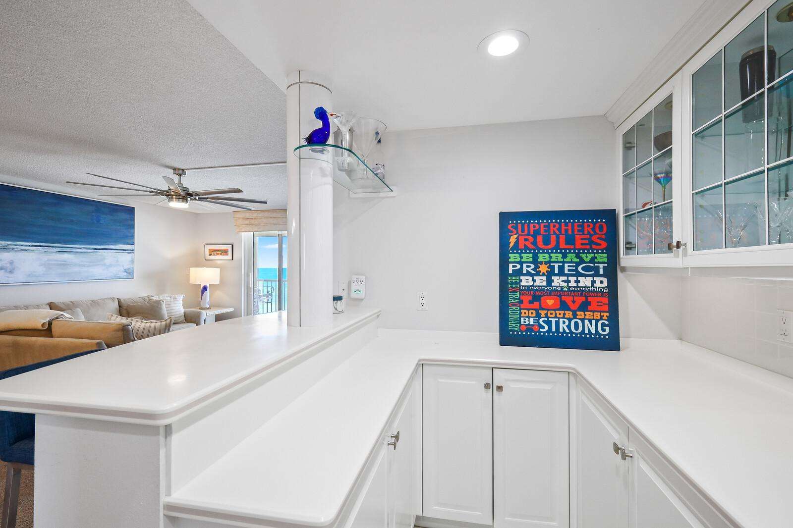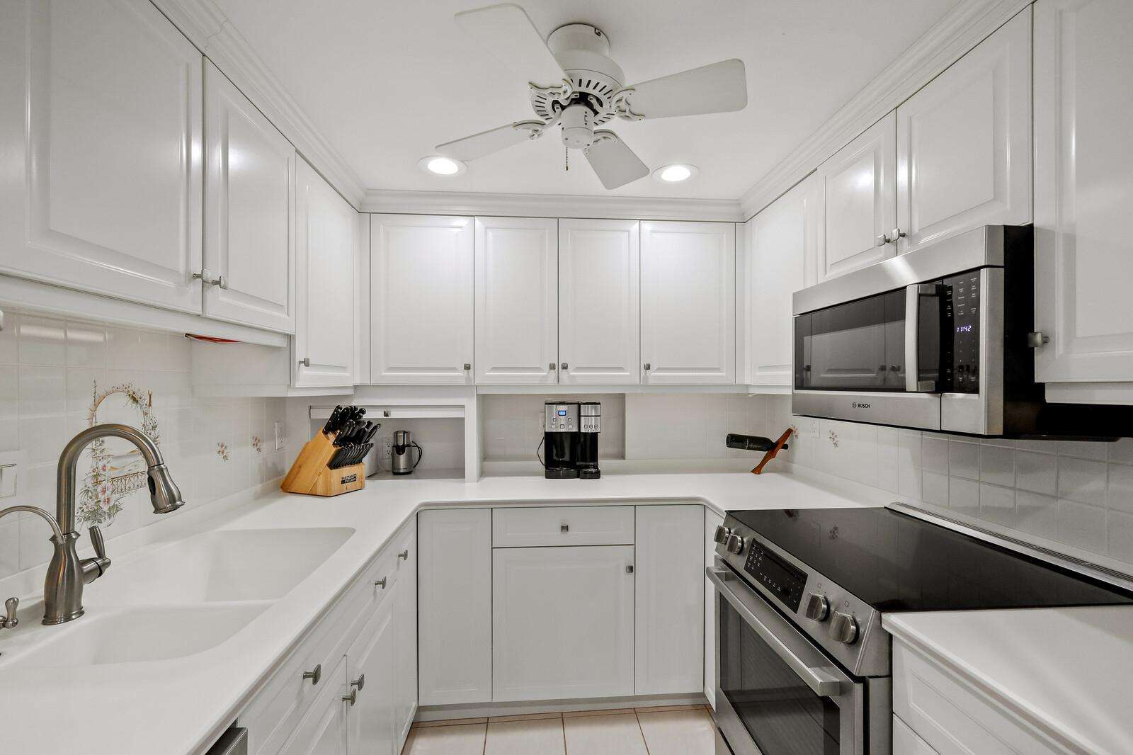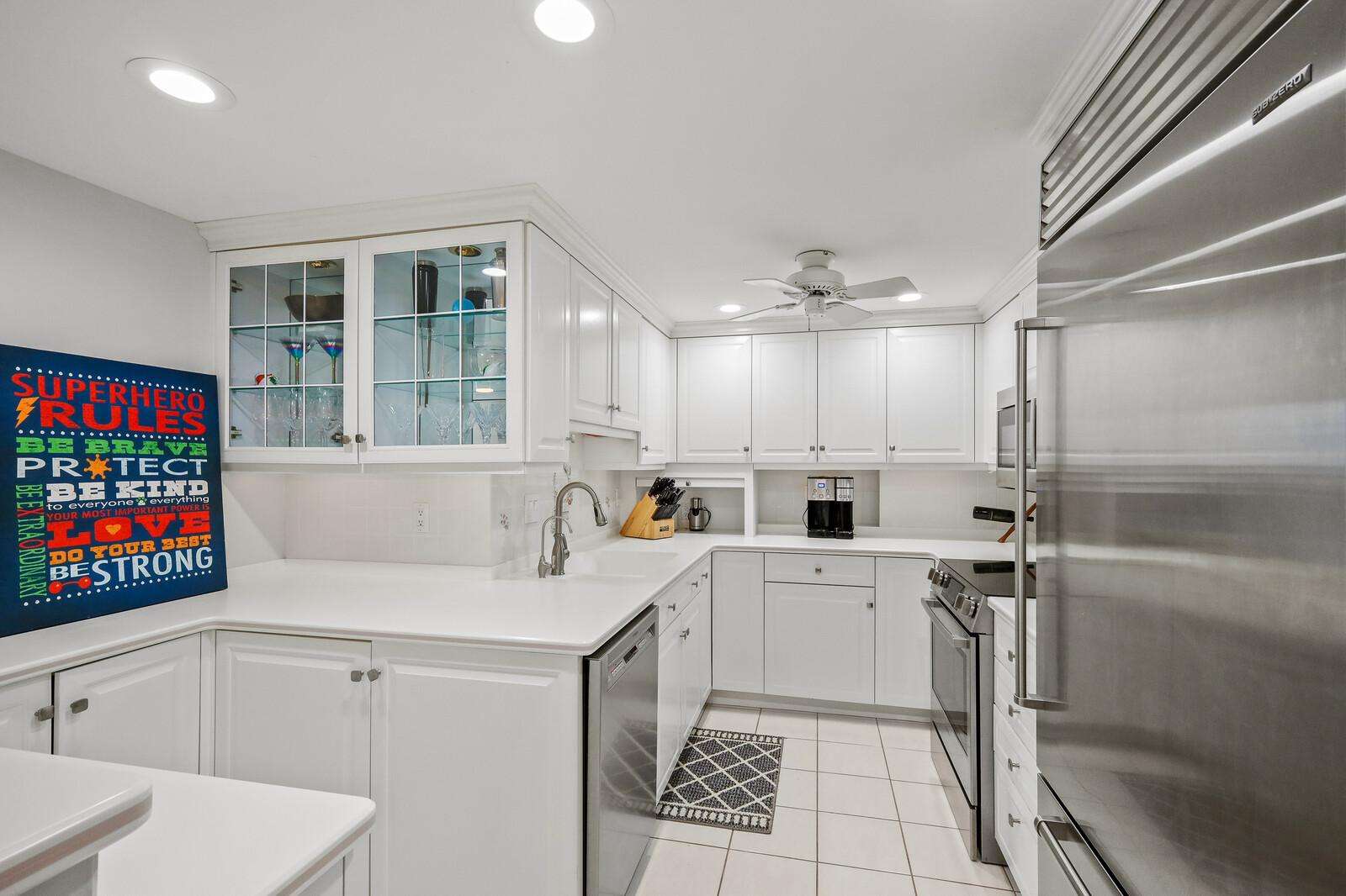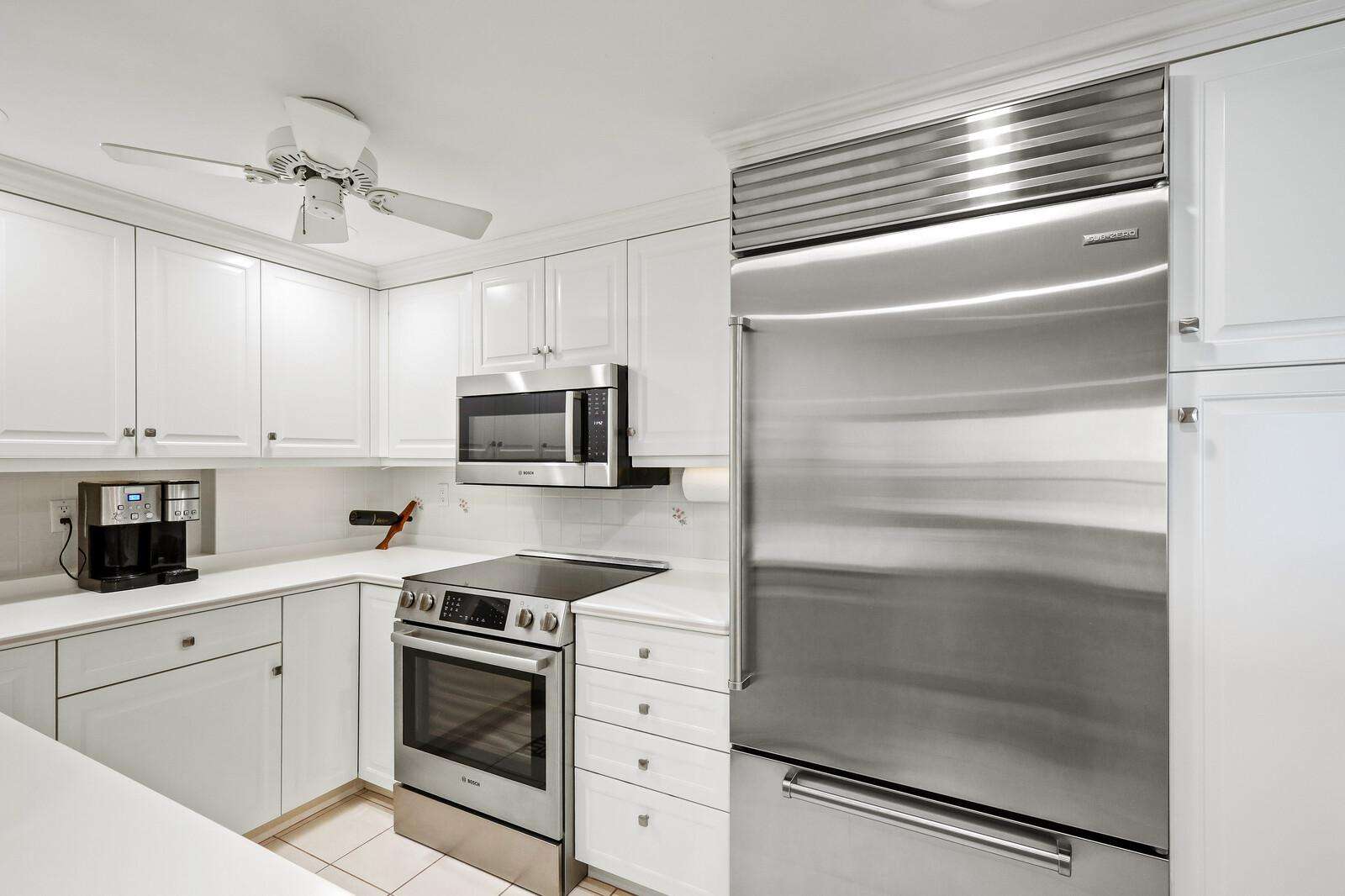 Updated kitchen with modern appliances, ample counter space, and a clean coastal design
