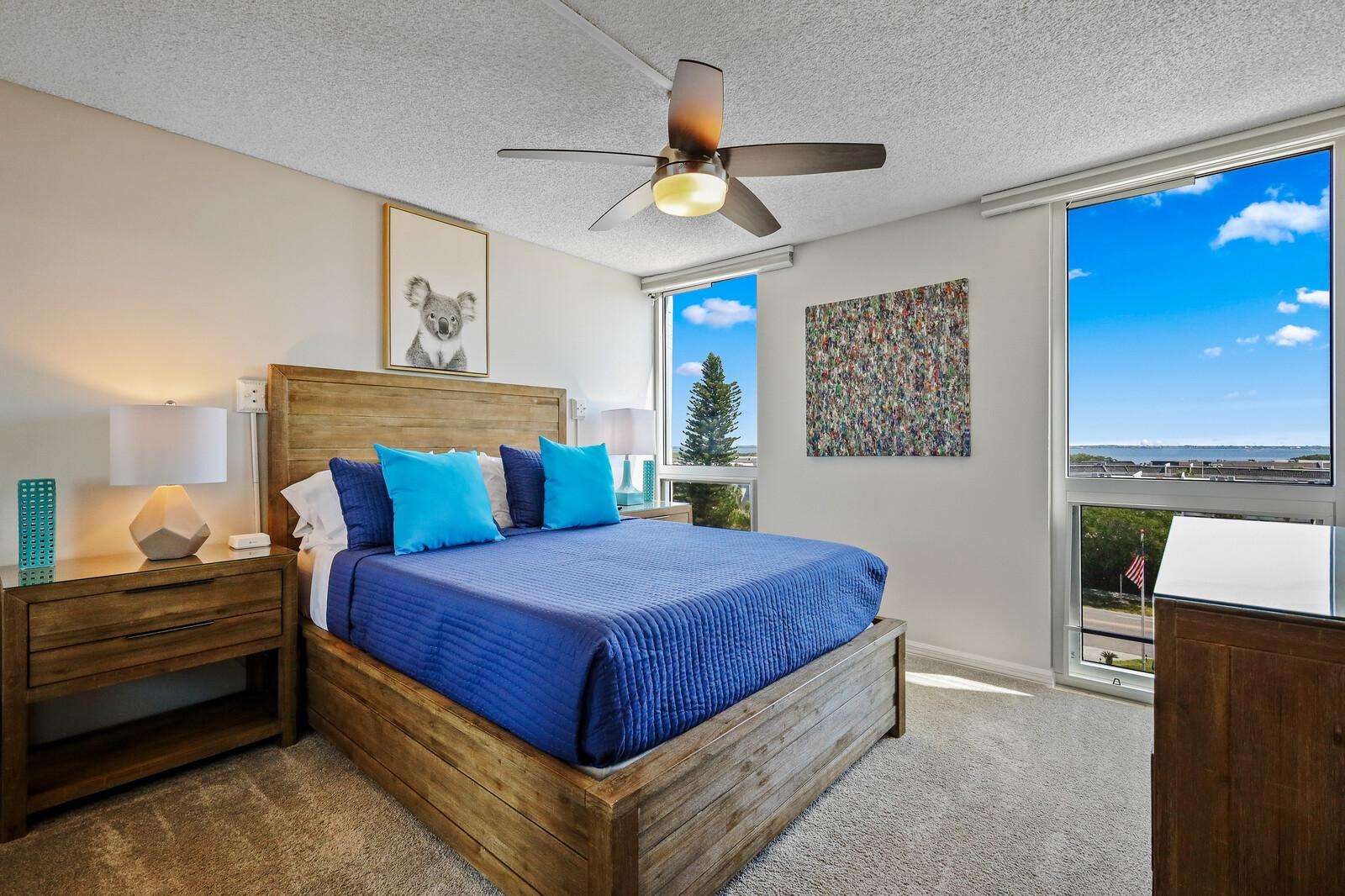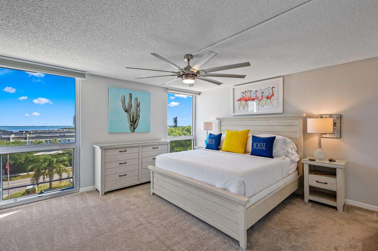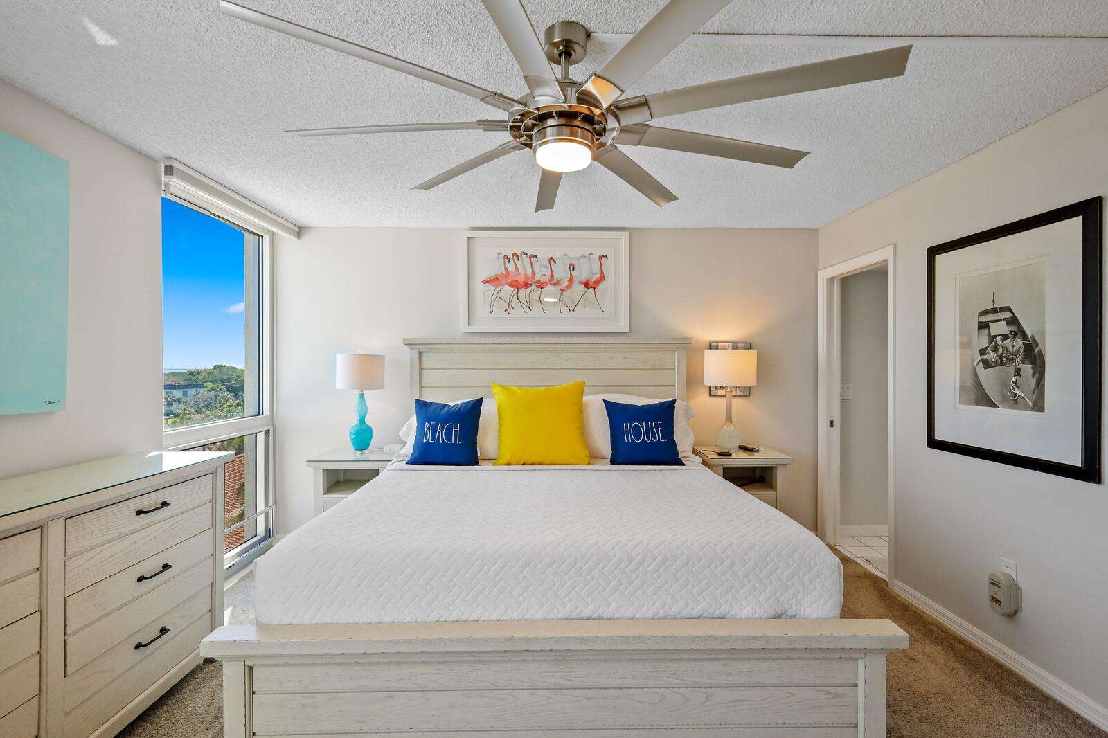 Bright master bedroom with ocean views and coastal charm