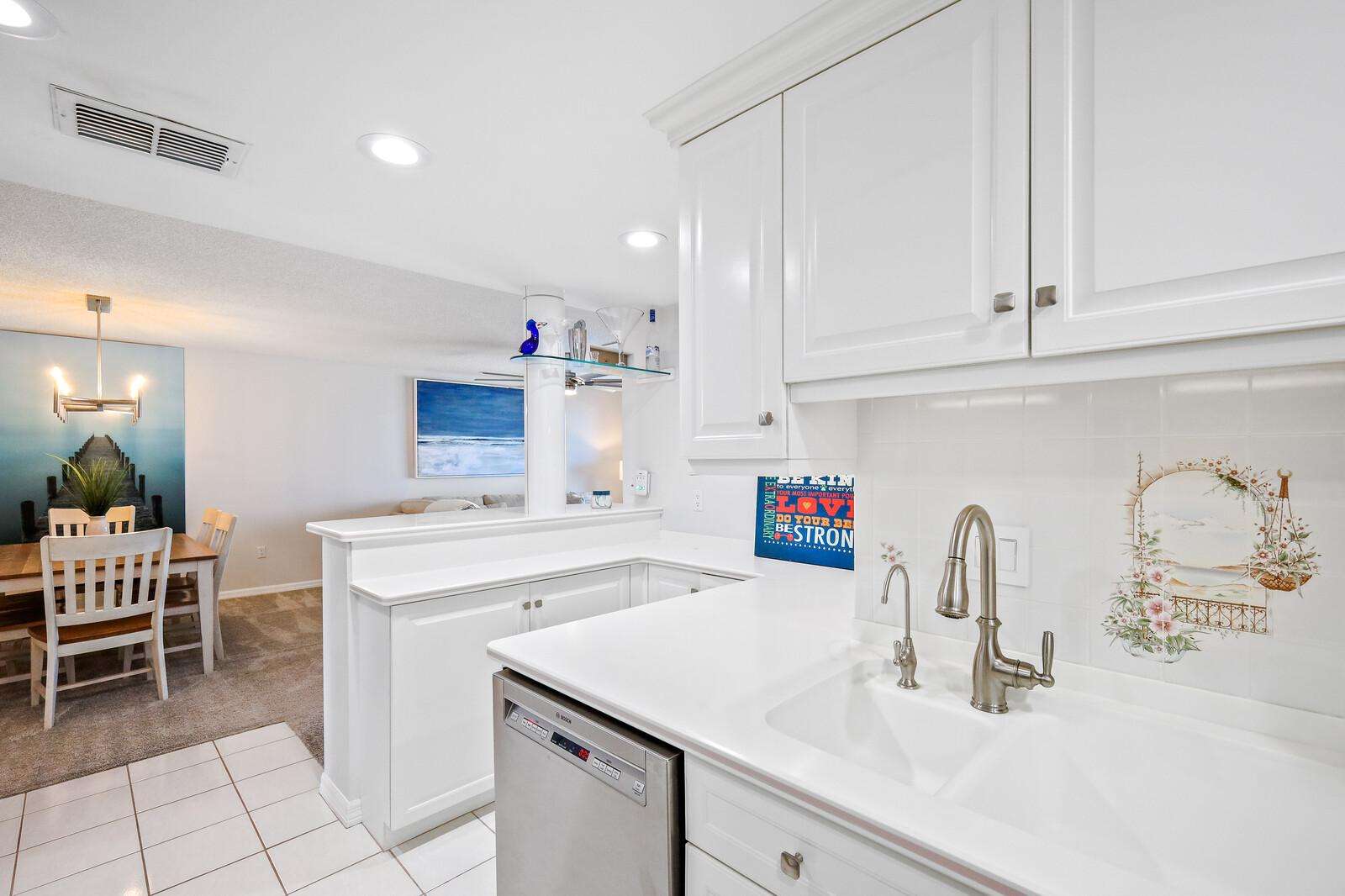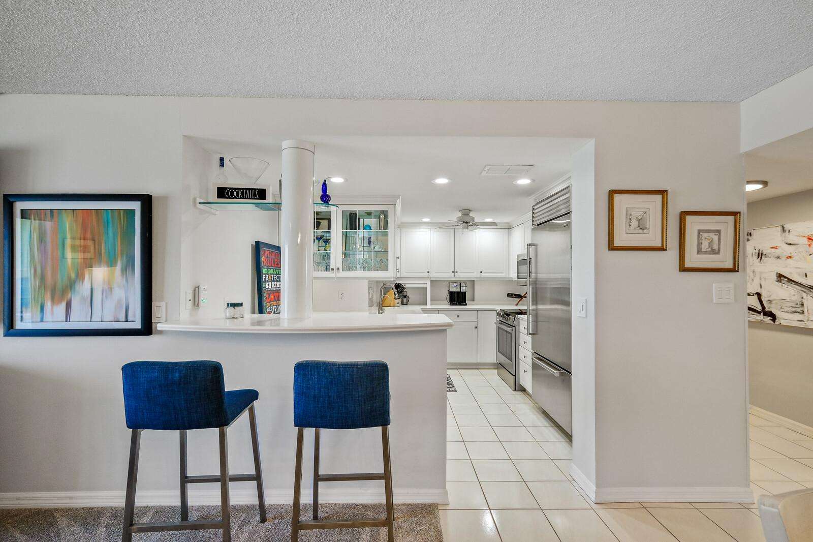 Bright kitchen with sleek white cabinetry and cozy breakfast bar seating