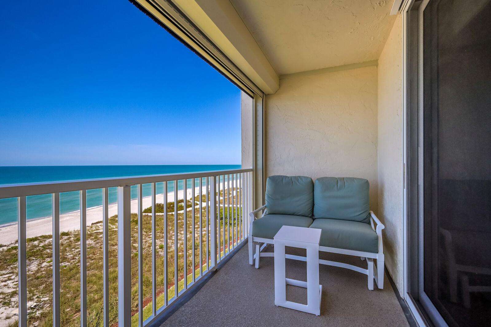 Direct Gulf Front balcony with cozy seating and stunning views