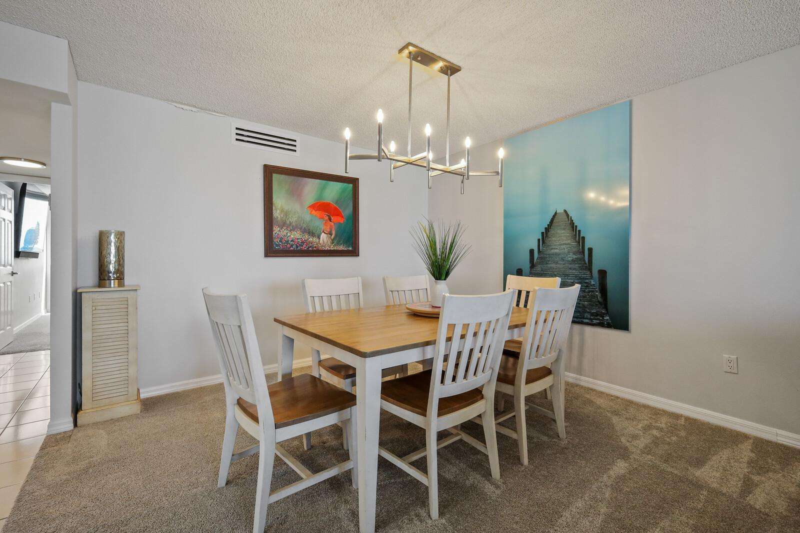 Bright dining area with modern chandelier and ocean artwork