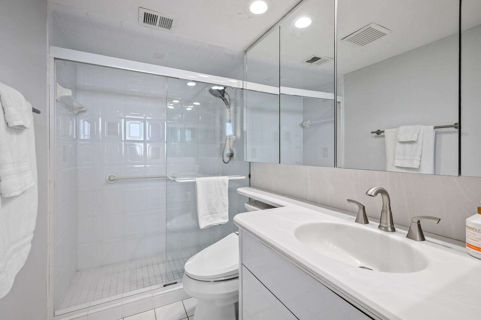 Bright, airy bathroom with modern fixtures and glass shower door
